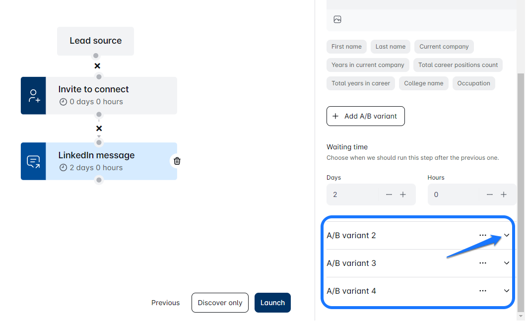 - In Sales Marketeer, you can test different parts of your message copy, such as LinkedIn messages, Emails, InMails, Invites to Connect, or even the timing between the steps during the campaign sequence creation process. You can create up to 5 different test variants!