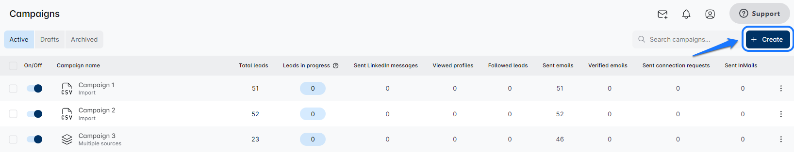 First up, head over to the Campaigns dashboard on Sales Marketeer. Look for the ‘Create’ button in the upper right corner and give it a click. It’s your first step to something great!